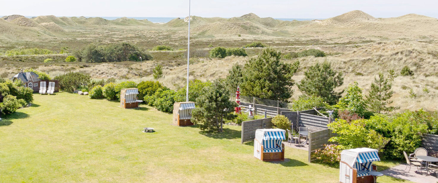 In ruhiger Lage genießen Sie von fast allen Appartements aus einen traumhaften Ausblick über die Dünen bis hin zum Meer. Der weitläufige Garten mit Strandkörben, Essplätzen und Sonnenliegen steht zu Ihrer Verfügung.