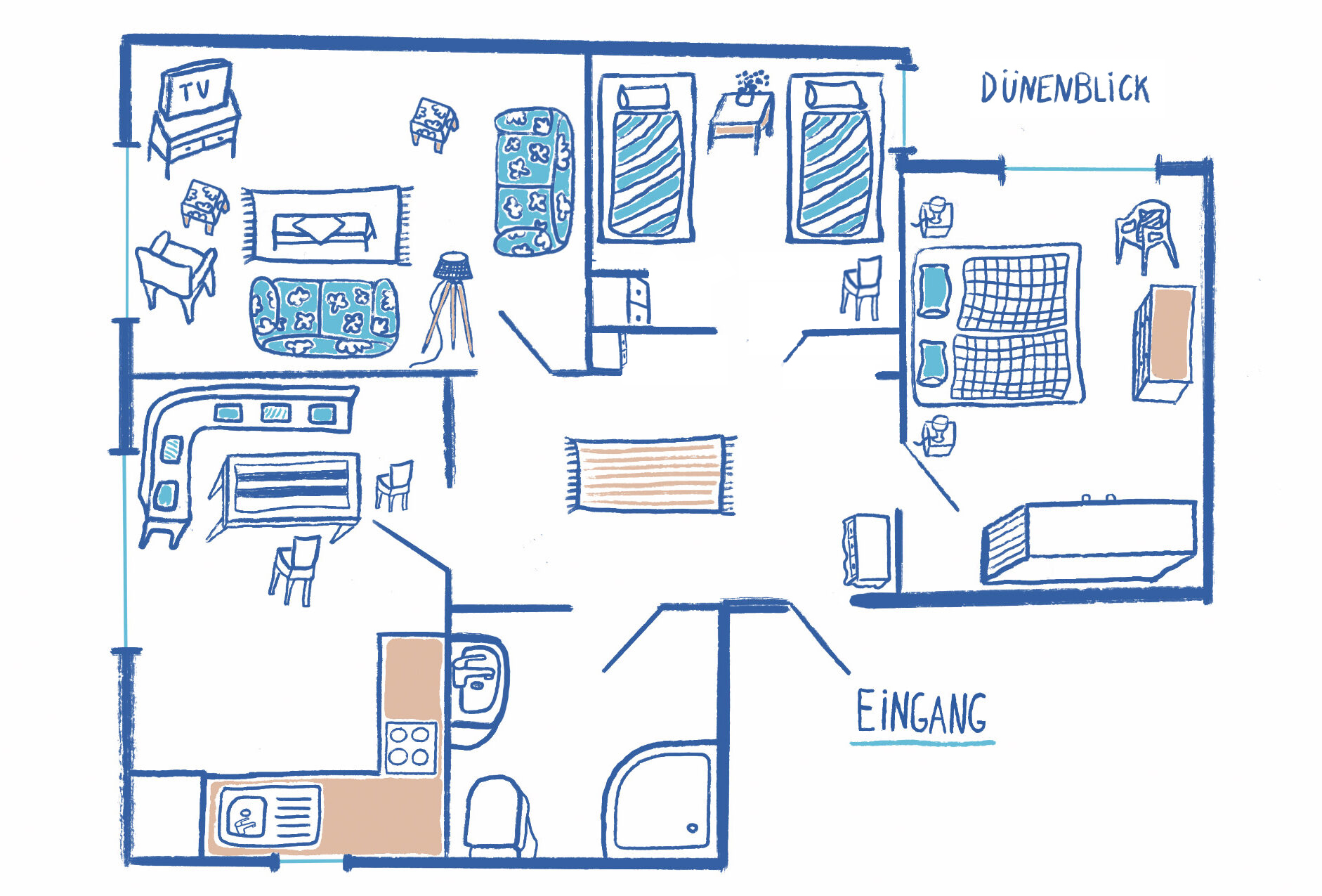 Dieses Appartement ist im nordisch-friesischem Ambiente eingerichtet. Sowohl Elternschlafzimmer mit Doppelbett als auch das Kinderzimmer mit zwei Einzelbetten bieten eine herrliche Aussicht auf die Dünen.