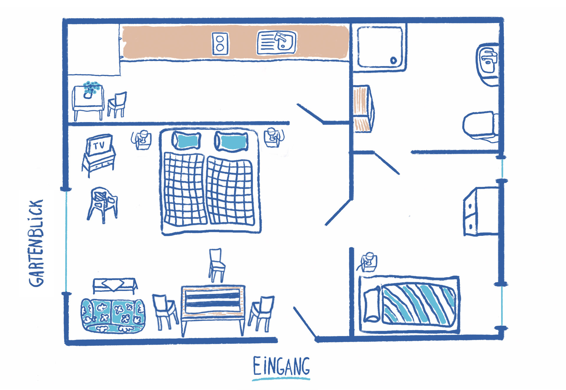- Wohn-Schlaf-Essbereich mit Doppelbett (Bettbreite 1,80m)