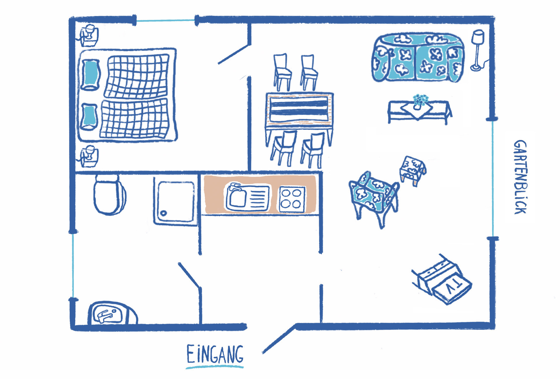 - Voll ausgestattete separate Küche mit Filter-Kaffeemaschine, Toaster, Wasserkocher